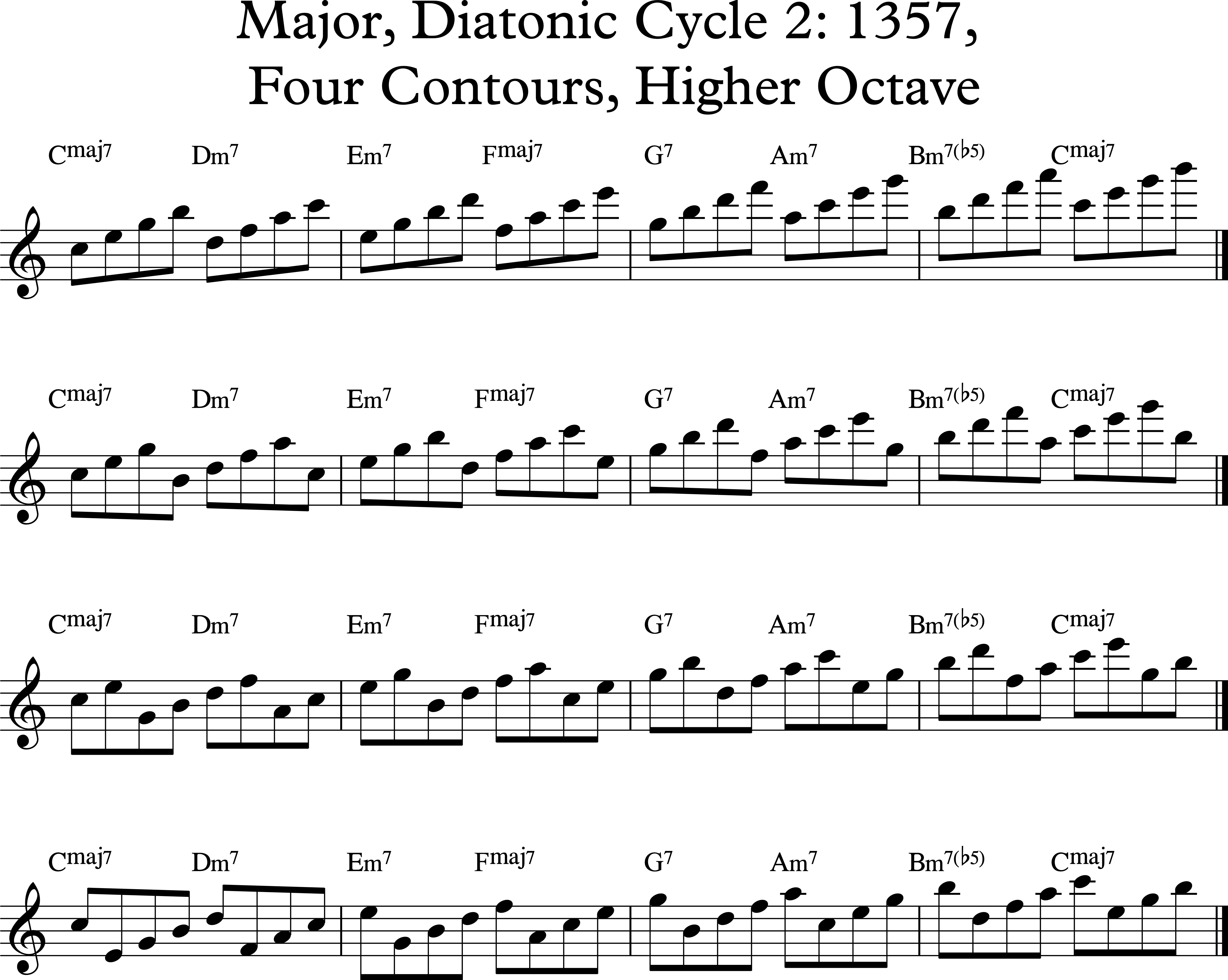 Though notated as C Major 7 arpeggios, these permutations can represent other harmonies. I highly recommend playing the permutations through harmonized scale “cycle” progressions, “tweaking” the intervals to suit the chord qualities involved in a given progression: