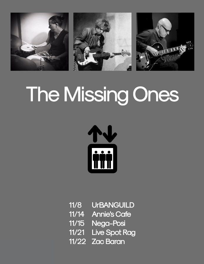 The Missing Ones are Dan Cosley on guitar, Dave Moss on bass, and Patrick Golden on drums. The UrBANGUILD and Zac Baran shows will feature Andy Couzens on synths and electronics, and Video art by [sic]).